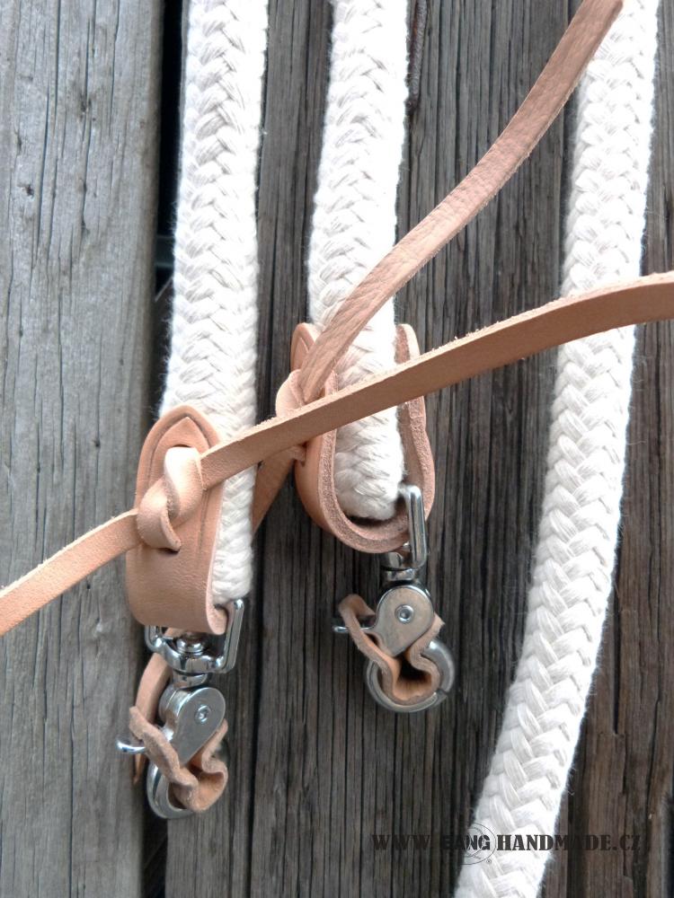 Otěže jsou zakončeny zpětným zápletem lana, tím vzniknou těžší konce, které jsou užitečným pomocníkem při jízdě na koni. Kožené koncovky na krabiny jsou vyrobeny ze silné pevné kůže.