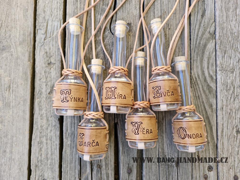 Klasická skleněná koštovaška vsazená do kůže na pověšení na krk. Koštovačku zdobí Vámi vybraný motiv raznice. Kdomě něho Vám na koštovačku můžeme napsat písmeno, jméno, číslici.