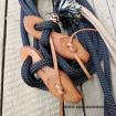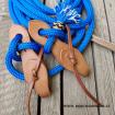 Komplet obsahuje mecate 6,5m 12mm a slobber-straps 18cm rozpínací. Na kompletu si jen nastavíce délku otěží a můžete vyrazit. Díky tomu, že jsou slobbery straps rozpínací nemusíte celé lano provlékat slintáky. Pouze je zorvážete, nasadíte do udidela můžete vyrazit. Slabší a lehčí lano je pro jemnější a citlivější práci s koníkem.