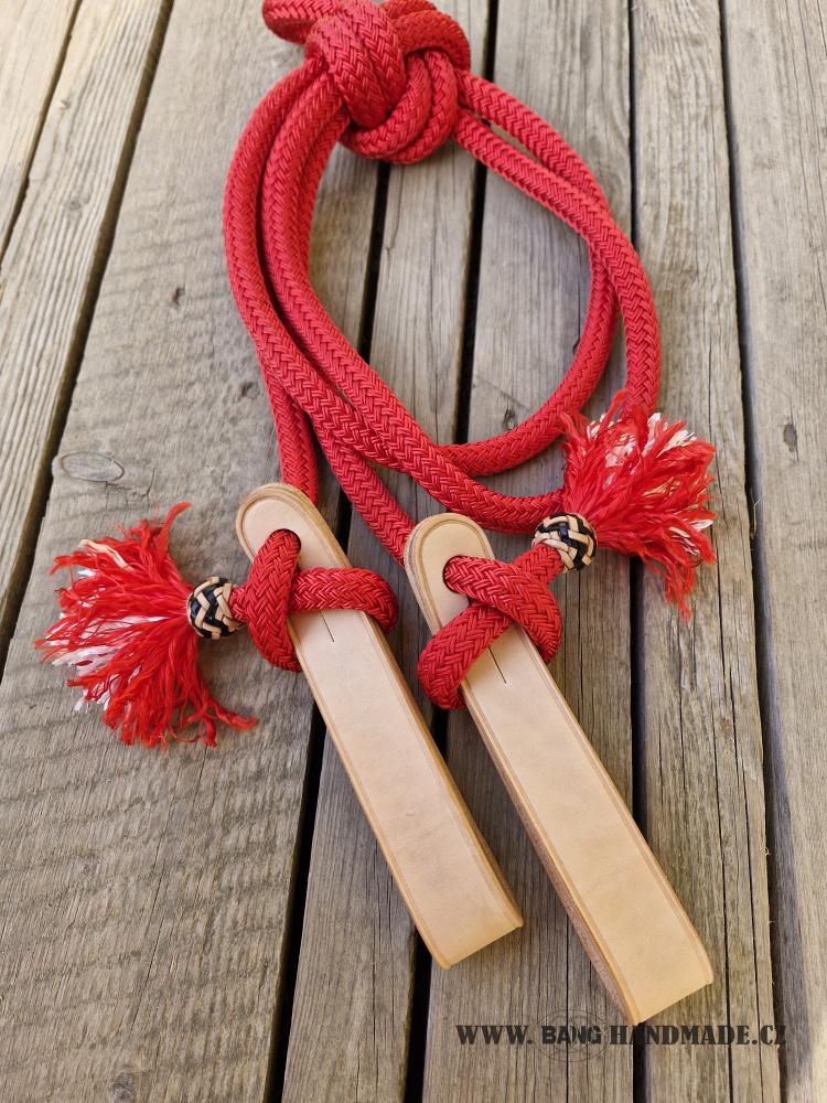 Otěže jsou zakončeny zpětným zápletem lana, tím vzniknou těžší konce, které jsou užitečným pomocníkem při výcviku koníka. Na obou koncích je lano prošito a ukončeno malým střapečkem.