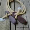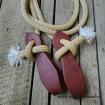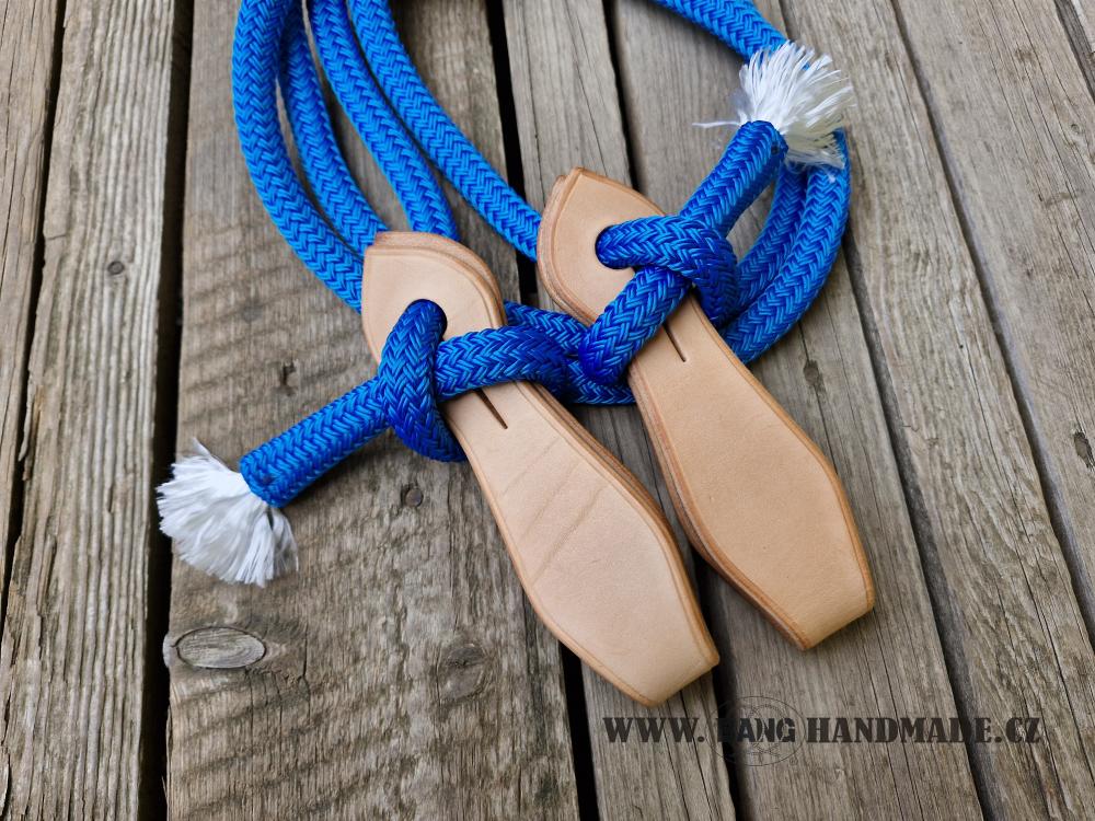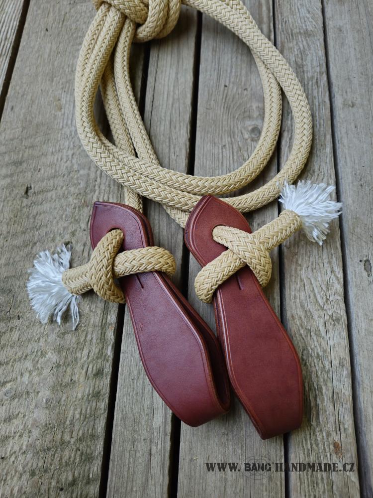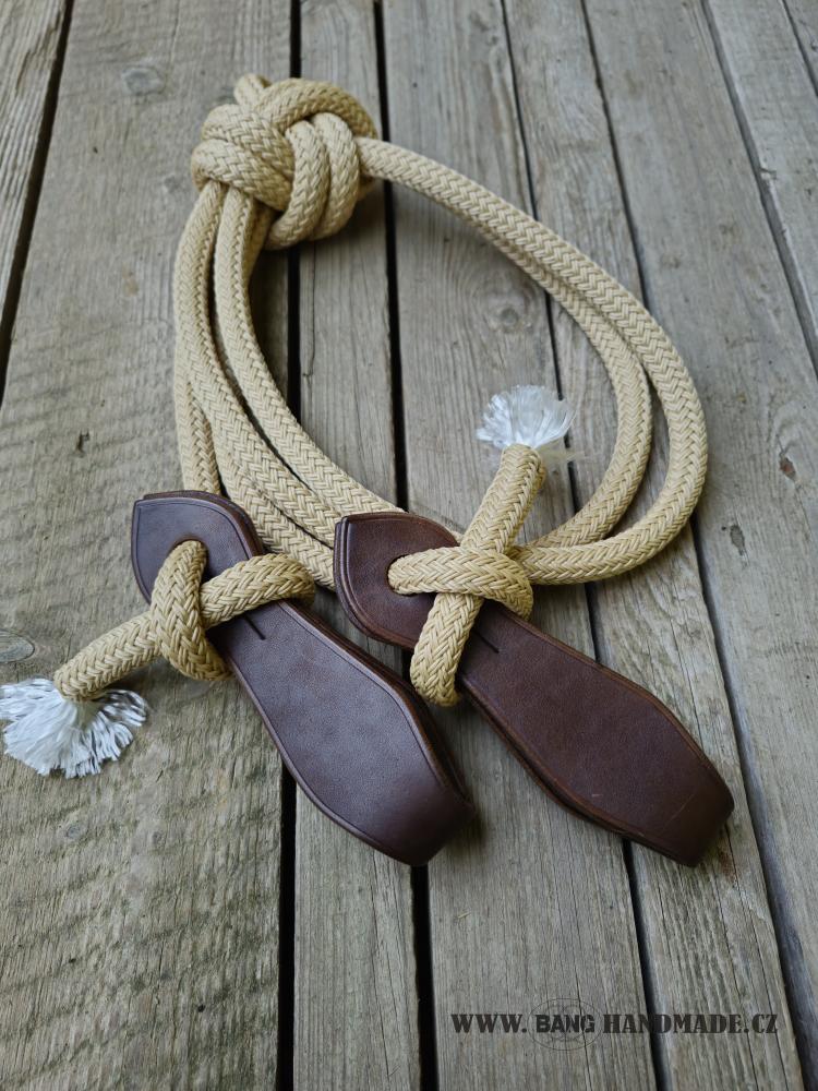Otěže jsou zakončeny zpětným zápletem lana, tím vzniknou těžší konce, které jsou užitečným pomocníkem při výcviku koníka. Na obou koncích je lano prošito a ukončeno malým střapečkem.