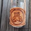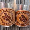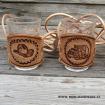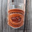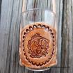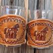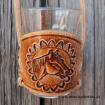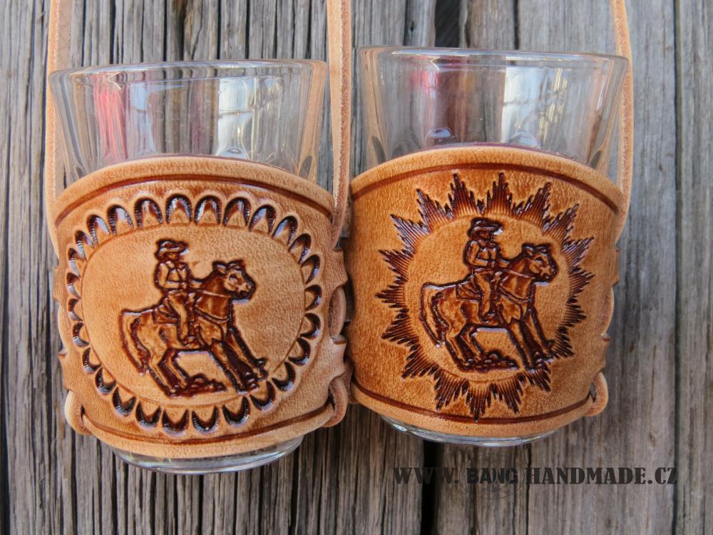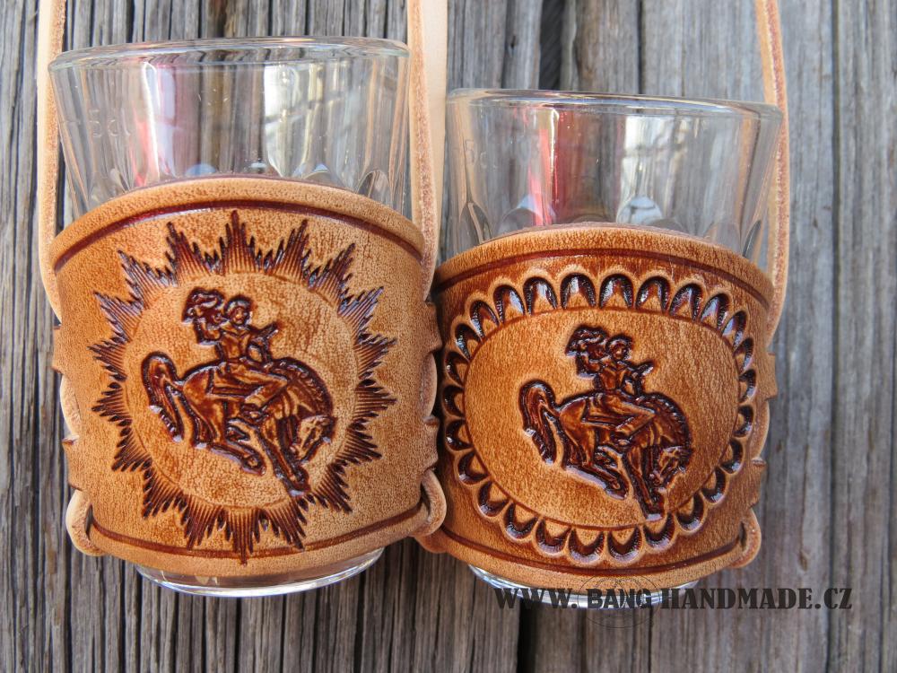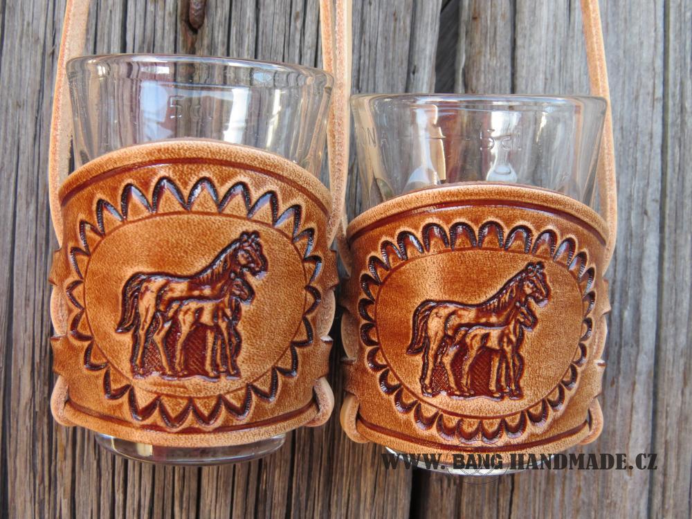 Klasický skleněný velký panák, který je pevně vsazen do koženého originálně ozdobeného prstence. Vše zavěšeno na pevném řemínku.