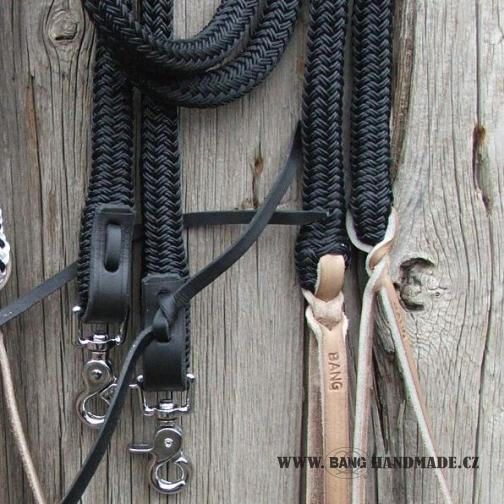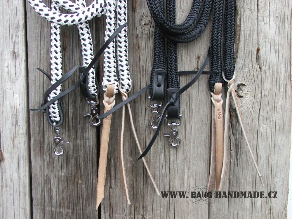 Otěže jsou zakončeny zpětným zápletem lana, tím vzniknou těžší konce, které jsou užitečným pomocníkem při výcviku koníka.