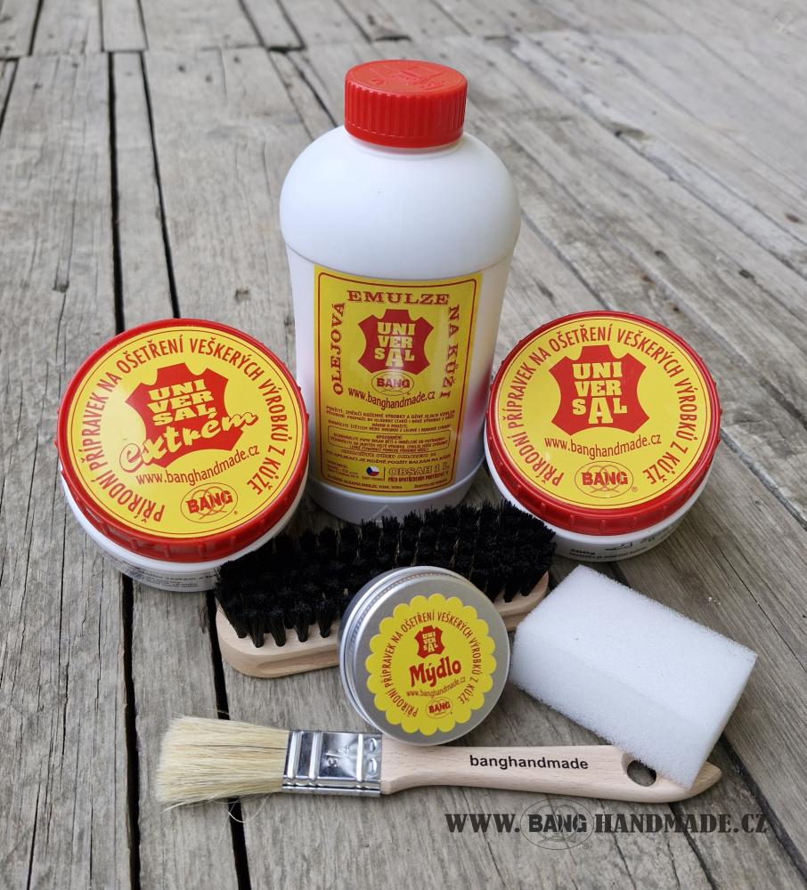 Sada na ošetření kožených výrobků. Sada obsahuje mýdlo na umytí kůže s houbičkou, balzám univerzal a extrem s houbičkami a kartáč, kterým snadno vyčistíte záhyby od přebytečného balzámu. Olejovou emulzi se štětcem pro lepší aplikaci.