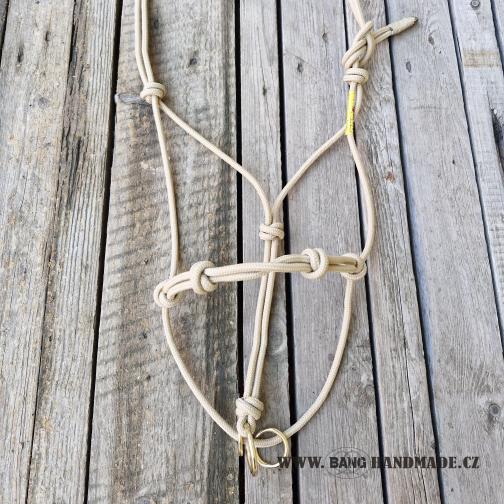 Patní uzel ohlávky je nahrazen třemi volně pohyblivými mosaznými kroužky.