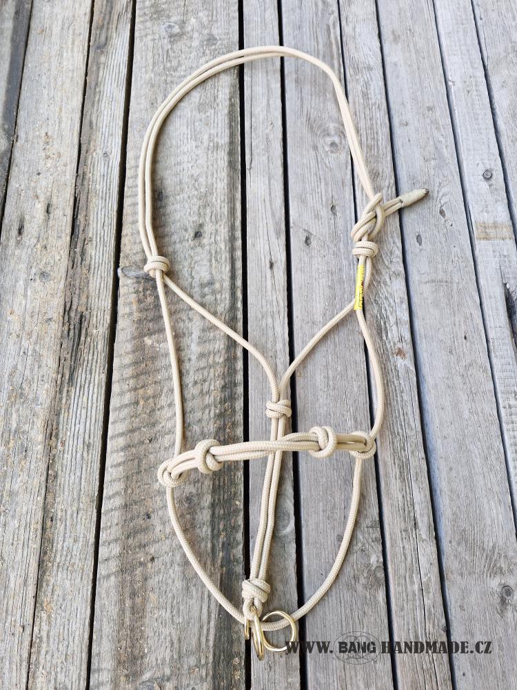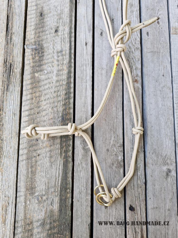 Patní uzel ohlávky je nahrazen třemi volně pohyblivými mosaznými kroužky.